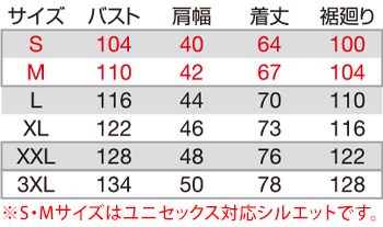 ※SとMのレディースサイズはボディーラインをよりキレイに見せるジャストフィットシルエット仕様です。