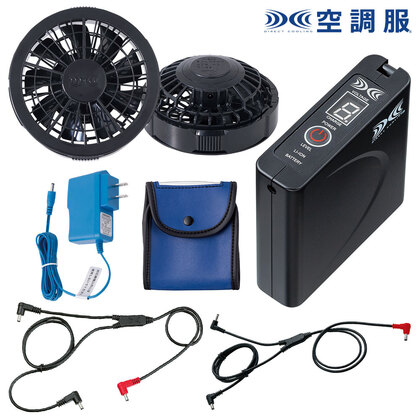 赤色LEDを採用し、屋外での視認性が向上しました。JIS IP55(防塵防水)規格適合。※水没等の水の浸入による故障を保証するものではありません。ワンボタンでの簡単操作。 9段階のバッテリー残量表示機能付き。ファン(2個)、ケーブル、ロングケーブル、風量調節機能付きの大容量バッテリー、ACアダプター、バッテリーケース入り。