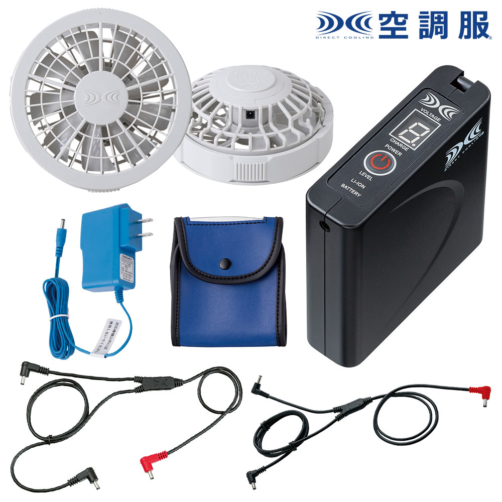 赤色LEDを採用し、屋外での視認性が向上しました。JIS IP55(防塵防水)規格適合。※水没等の水の浸入による故障を保証するものではありません。ワンボタンでの簡単操作。 9段階のバッテリー残量表示機能付き。ファン(2個)、ケーブル、ロングケーブル、風量調節機能付きの大容量バッテリー、ACアダプター、バッテリーケース入り。