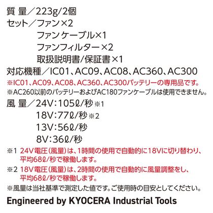 ※IC01、AC09、AC08、AC360、AC300バッテリーの専用品です。AC260以前のバッテリーおよびAC180ファンケーブルは使用できません。※この商品はカラーによって販売価格が異なります。