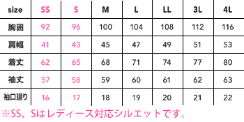 ※SSとSのレディースサイズはレディースシルエット仕様です。