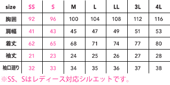 ※SSとSのレディースサイズはレディースシルエット仕様です。