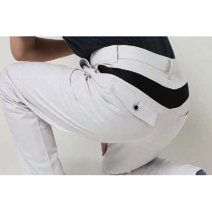 後ろ腰部は通気性を確保し、屈伸をスムースにサポートするフレキシブルメッシュ仕様。股下にはイヤなニオイを防ぐ消臭テープ付き。