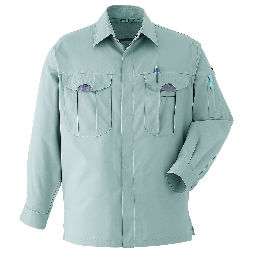 綿のソフトな肌当たりとポリエステルのしなやかな風合いを併せ持つ、吸汗性に優れた裏綿素材。夏場に何かと便利な袖口ロールアップ仕様。汚れが付きにくく、落ちやすいプラズマ防汚加工にも要注目!イヤなパチパチを防ぐ帯電防止機能付き。