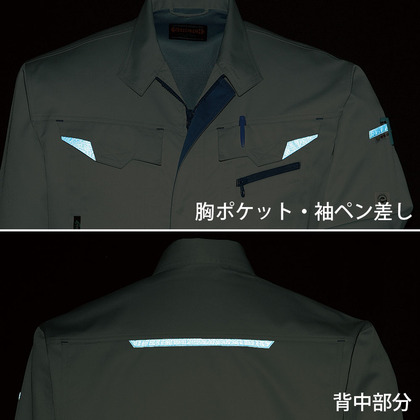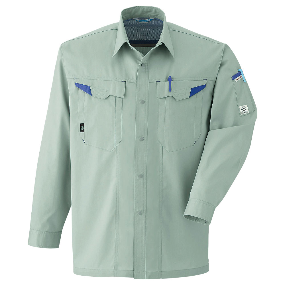 激しい動きにもしっかり対応してくれる優れたストレッチ性でタフな現場を強力にサポートする長袖シャツ。汚れを寄せ付けないプラズマ加工も大好評!JIS T-8118対応の高度な帯電防止仕様。夜間の視認性を高め、危険回避に役立つ再帰反射テープ付き。
