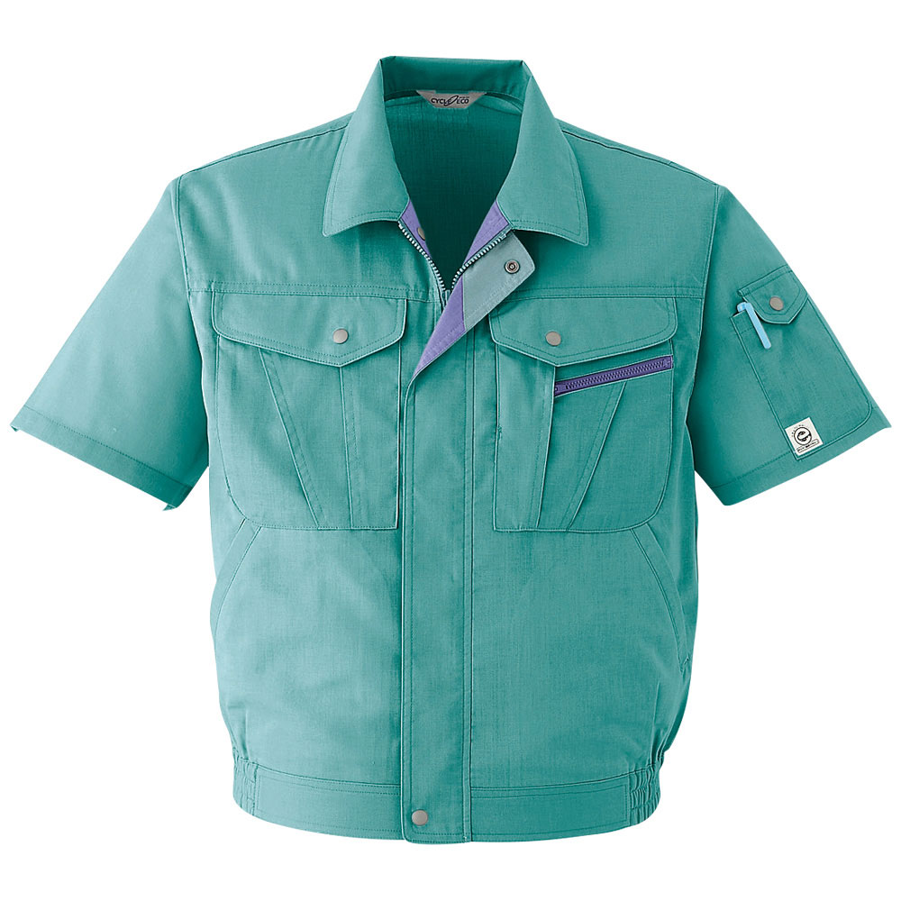 腕の動きをスムースにし、運動性能を高める肩口ノーフォーク仕様。しなやかなポリエステルを肌当たりソフトなナチュラルコットンで包み込んだ二層構造素材はストレッチ性と吸汗速乾性に優れ、作業性良好。ポケットの開閉をせずに携帯電話の出し入れができる「携袋革命」にも要注目!イヤなパチパチを防ぐ帯電防止機能付き。
