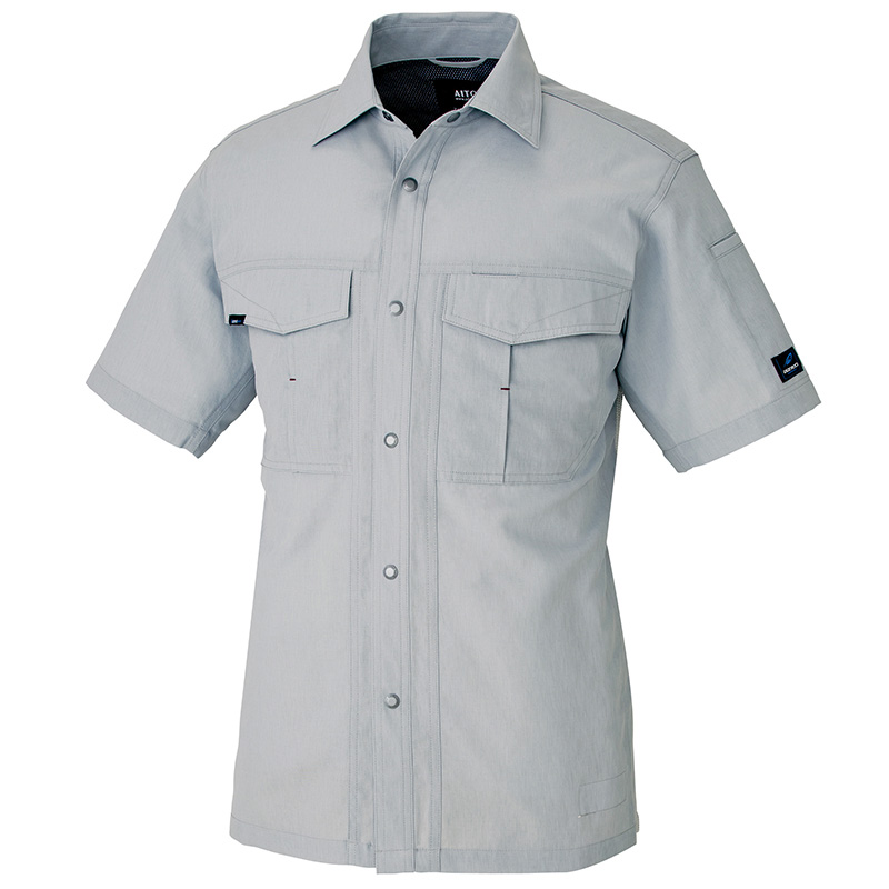 袖、見頃、背中と各所に配したメッシュ構造で抜群の通気性を実現した半袖シャツ。シャリ感のある清涼素材は肌当たりが超さわやか。お手入れラクラクのイージーケア性もマル。