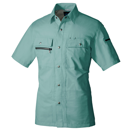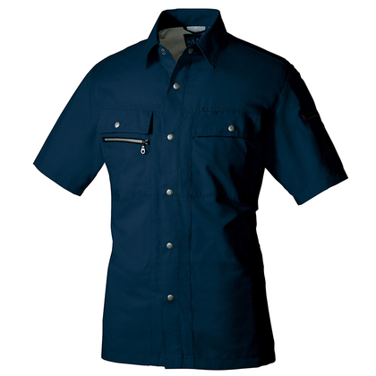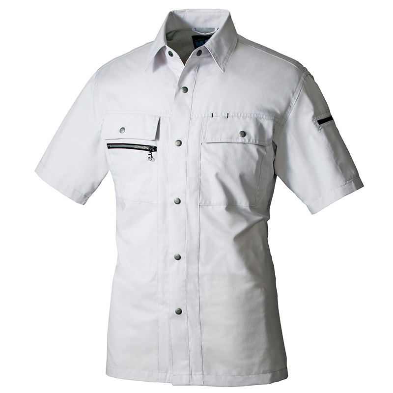背中に風が通るメッシュ構造を採用したヨーク&ノーフォーク仕様で通気性抜群の半袖シャツ。腕のつっぱり感を解消する独自の「ドルフィンカット」で運動性能もベリーグッド。綿の肌当たりの良さとポリエステルのタフな耐久性をベストミックスさせた、真夏の現場で「使える」一着。